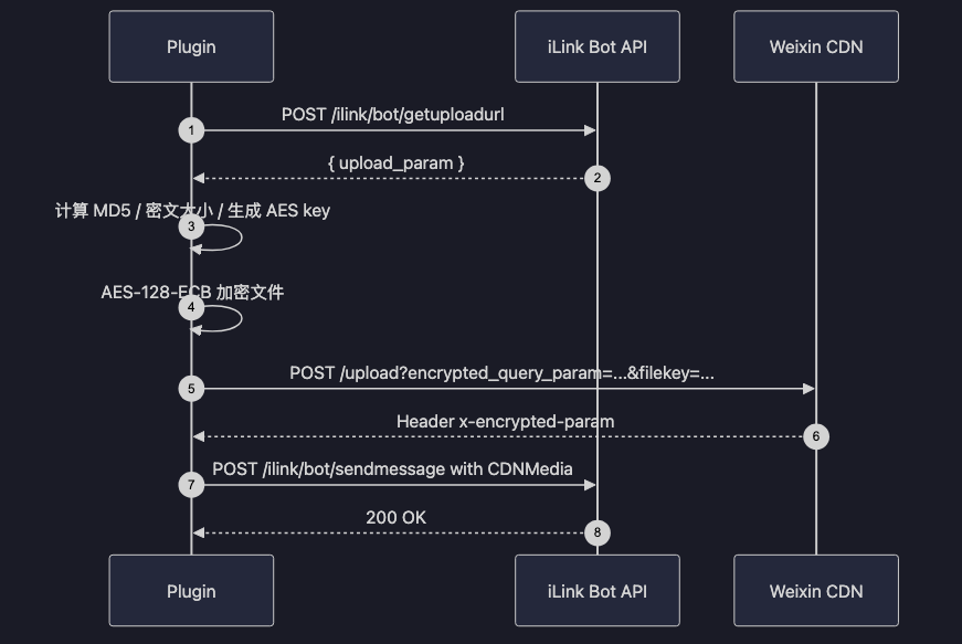 数据面则只有一件事:媒体文件通过 CDN 上传/下载,本地做 AES-128-ECB 加解密。